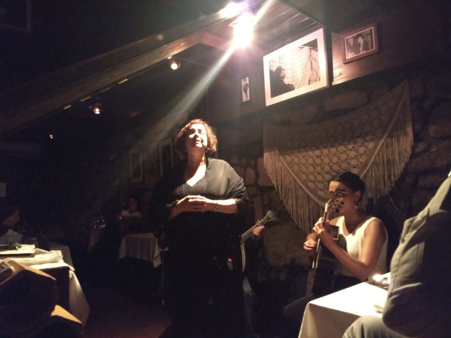 So, we finally decided we'd just have to get over there by Metro. We dashed through the pouring rain, the 1/2 mile to our metro stop, caught the one headed for Sao Bento, with a change at Trindade, and speed-walked the 1/2 mile or so, still in pouring rain, to the restaurant. We arrived at 8:30. Luckily, dinner orders were still being taken, and the show hadn't started yet.