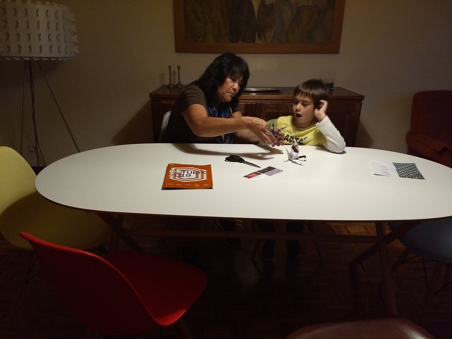 Back at the apartment, Nancy was teaching Pedro how to make an origami crane. His English had been somewhat tentative before, but he got quite chatty as he and Nancy sat, head-to-head, working on their project.