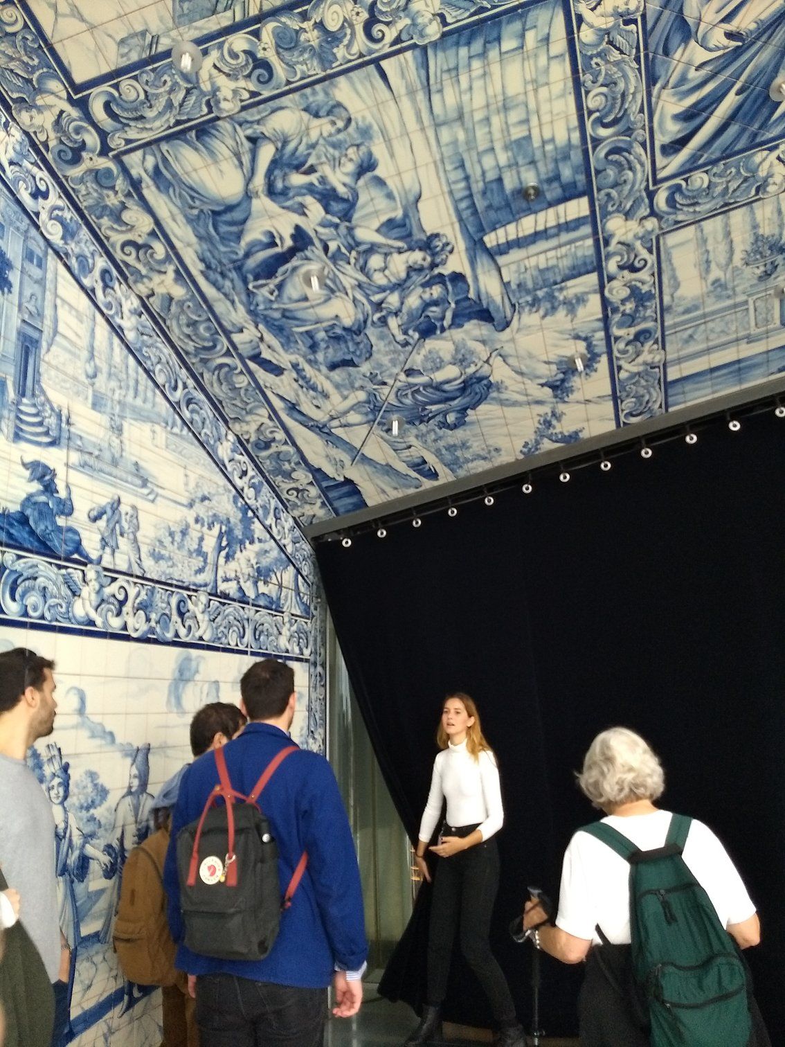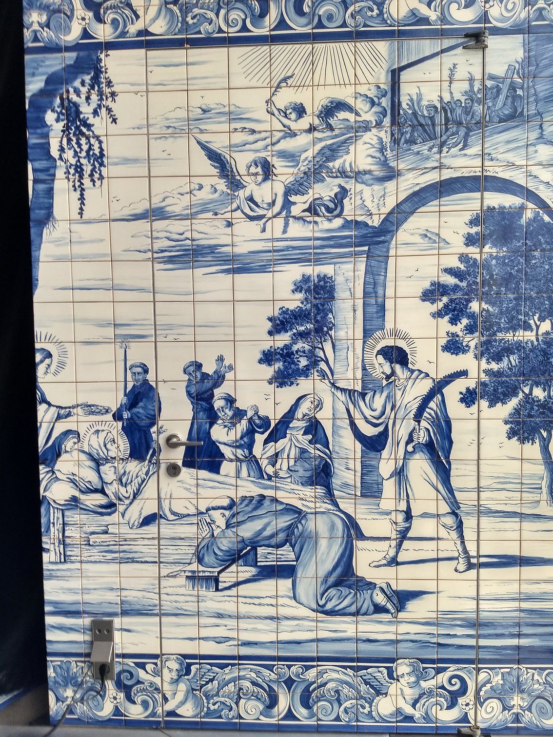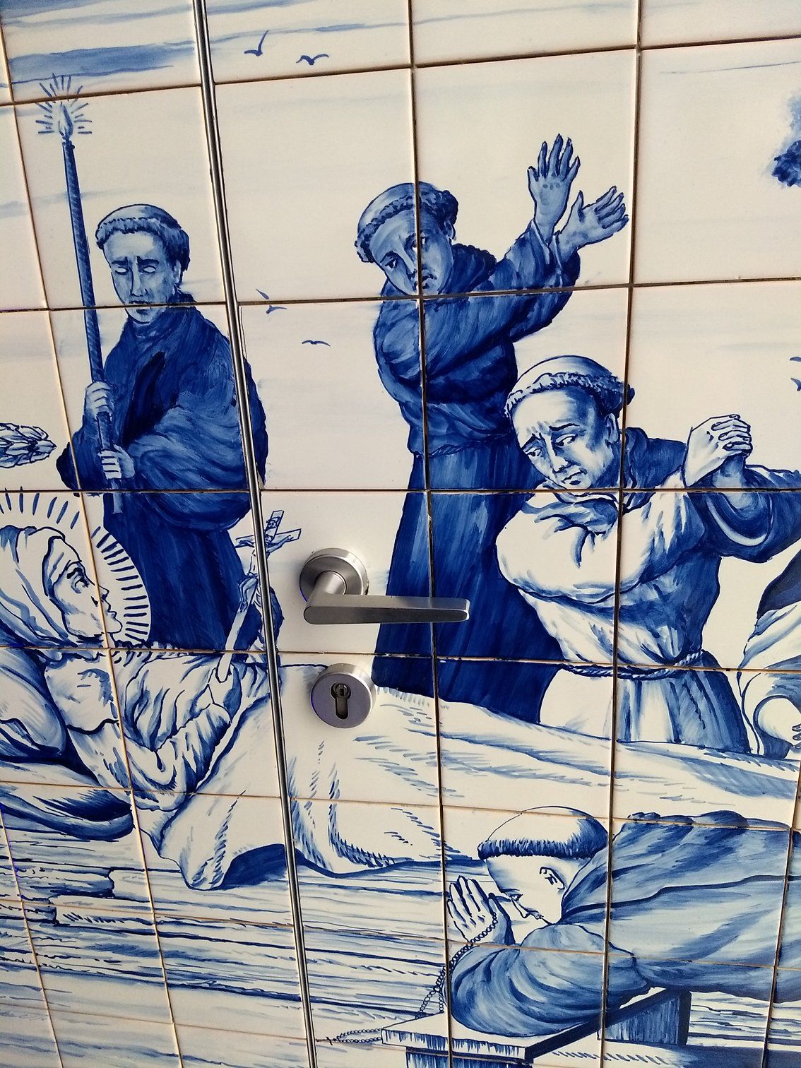 | A door incorporated into the room tiled with traditional Portugese murals |