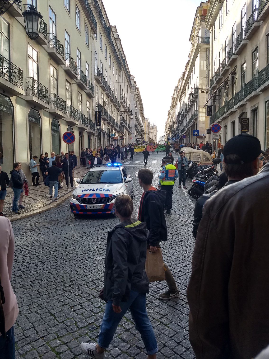 We got settled in and luckily the rain stopped. We headed out to find the grocery store, another Pingo Doce, and get our bearings in town. Our neighborhood was within walking distance of the main part of town, and plenty of shopping and restaurants. As we walked along we encountered a demonstration march blocking one of the main streets. The marchers carried signs denouncing human trafficking, and were escorted by police.