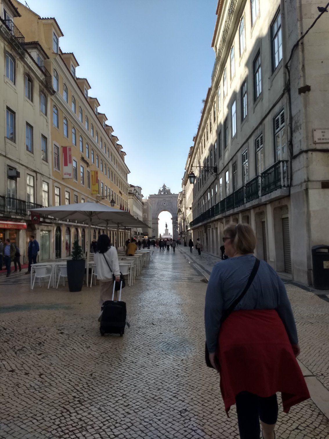 | A pedestrian street in the main part of town, leading to the famous arch at the Praca do Comercio |